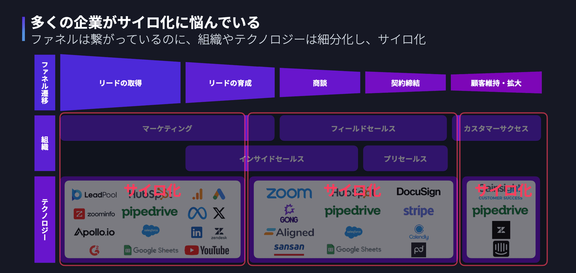 現代のBtoBビジネスにおいてRevOpsが求められる背景には、従来の組織体制が抱える課題があります。最大の課題は部門間の分断(サイロ化)です。マーケティング、営業、CSといった部門ごとに最適化された運営をしていると、どうしても他部門との連携が希薄になり、情報やプロセスが断絶してしまいます。その結果、各部署は自部門のKPI達成には注力できても、企業全体としての連携した価値提供ができず、見込み客から顧客への一連の流れで非効率や抜け漏れが生じてしまいます。